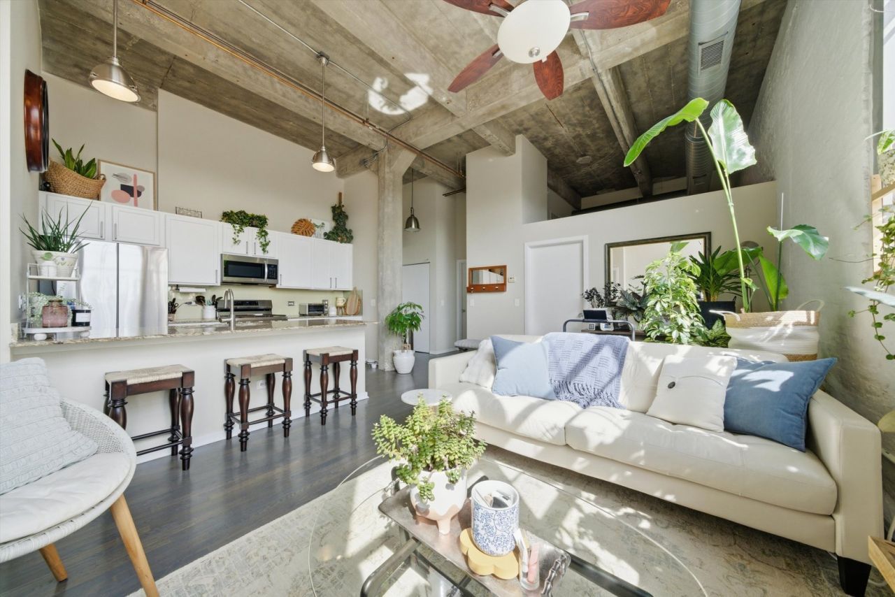 Rarely does a Bucktown loft offer this combination - top-floor privacy, unobstructed east-facing Chicago skyline views, and a level of custom upgrades that most listings simply can't match. Fully transformed and move-in ready, this is the kind of home that doesn't sit. This stunning 2 bed, 2 bath exposed brick and concrete loft delivers a desirable split floor plan with bedrooms positioned on opposite ends for maximum privacy. Soaring oversized windows frame sweeping city skyline views to the east, flooding the space with natural light and creating a backdrop that makes every day feel elevated. Hardwood floors run throughout - not a trace of carpet. The open-concept living and dining area is thoughtfully appointed with Hunter Douglas top-down/bottom-up window treatments, Restoration Hardware drapery hardware, and ceiling fans - designed for comfort, privacy, and style in equal measure. The kitchen is equipped with granite countertops, rich wood cabinetry, new Samsung stainless steel appliance package, and an oversized island perfect for seating and everyday entertaining. The primary suite is a true retreat - entered through elegant French doors leading to both a custom walk-in closet and a spa-adjacent en suite bath featuring Grohe fixtures and a custom-built shower bench. Blackout shades ensure restful sleep at any hour. What truly sets this home apart is its storage. Every single closet has been upgraded with custom Elfa organizational systems - the primary walk-in, both secondary bedroom closets, the entryway, and the kitchen, including pull-out and sliding under-sink organizers. This is a level of functional luxury rarely found at this price point. Additional highlights include a new LG stackable in-unit washer/dryer, Restoration Hardware pendant lighting at the entry, Grohe fixtures throughout both bathrooms and kitchen, and central heat and air. Building amenities include an elevator, fitness center, party room, courtyard, and rooftop deck with skyline views. One semi-private enclosed garage parking space is included, shared with just one other unit - a rare and coveted feature. Located steps from the 606 Trail, Walsh Park, and the best of Bucktown and Wicker Park - with easy access to 90/94, Metra, and the Blue Line. This is not a standard listing. This is a finished, curated home waiting for its next chapter.
